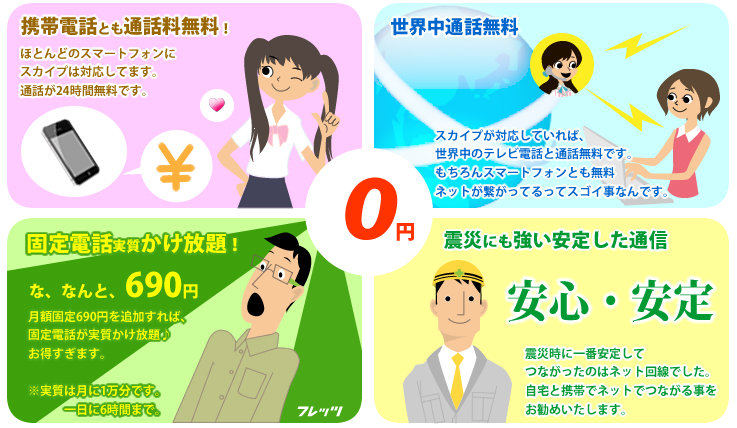 驚くべき事に、ネットが使えれば、携帯電話も通話料が無料なんです!24時間、携帯電話とも、通話料が無料です。 ※携帯電話のパケット代は携帯各社の契約により異なります。定額プランを推奨致します。 |